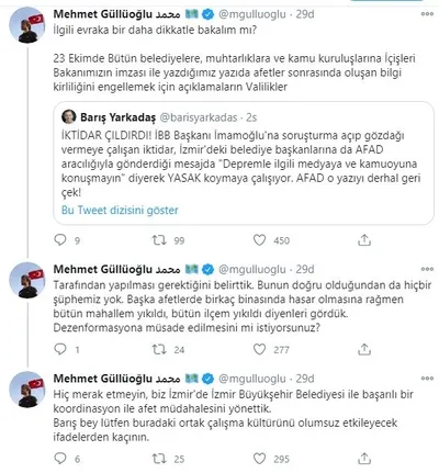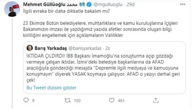 Mehmet Güllüoğlu; Barış Yarkadaş'ın "İktidar, İzmir'deki belediye başkanlarına da AFAD aracılığıyla gönderdiği mesajda 'Depremle ilgili medyaya ve kamuoyuna konuşmayın' diyerek yasak koymaya çalışıyor. AFAD o yazıyı derhal geri çek!" iddialarının yer aldığı paylaşımı etiketleyerek, şunları söyledi: