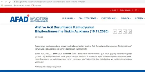 Afet ve Acil Durum Yönetimi (AFAD) söz konusu yazının 23 Ekim 2020 tarihinde, İzmir - Seferihisar depreminden 7 gün önce, geçmiş afetlerde oluştuğu görülen bilgi kirliliğini önlemek amacıyla Türkiye'deki tüm belediyelere ve muhtarlıklara hitaben yazıldığını açıkladı.
