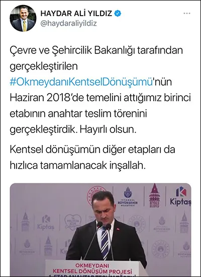 İBB Başkanı İmamoğlu, sosyal medyadan kendi projesi gibi lanse ettiği Beyoğlu Okmeydanı kentsel dönüşüm projesi için kamu kaynağını kullanarak vatandaşlara depreme karşı dayanıklı evler yaptıklarını ve yapacaklarını söyledi. Hatta İBB Başkanı İmamoğlu, "Beyoğlu Okmeydanı'nda kentsel dönüşüm projemizin ilk etabını tamamladık ve vatandaşlara anahtarlarını teslim ettik. Bu konuda hep birlikte, hızlıca hareket etmek zorundayız" dedi.