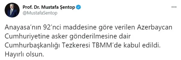 Başkan Şentop, Twitter'daki hesabında, "Anayasa'nın 92'nci maddesine göre verilen Azerbaycan Cumhuriyetine asker gönderilmesine dair Cumhurbaşkanlığı Tezkeresi TBMM'de kabul edildi. Hayırlı olsun." ifadesini kullandı.