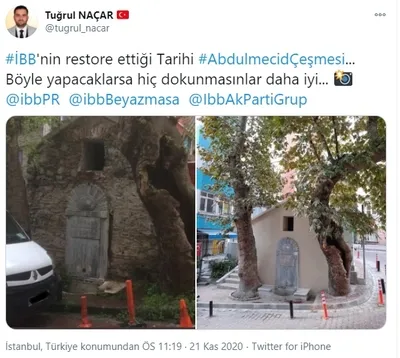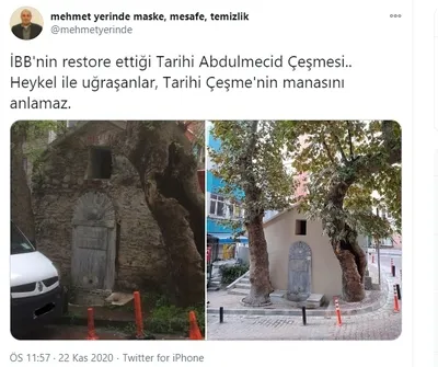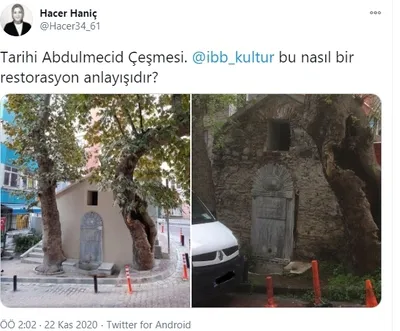 Tarihi yapılara sahip çıktığını iddia eden İstanbul Büyükşehir Belediyesi (İBB) restorasyonu faciaya çevirdi. Beşiktaş'ta bulunan 170 yıllık Abdülmecid Han Çeşmesi, İBB tarafından yapılan restorasyonla adeta talan edildi. Restore işleminin bitmesinin ardından sosyal medyaya düşen fotoğraflar sonrasında tepkiler meydana geldi. Tarihi çeşmenin eski ve yeni haline ait olduğu ifade edilen fotoğraflar paylaşılarak, restorasyona tepki gösterildi.