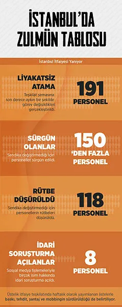 İstanbul İtfaiyesi'nde Memur-Sen'e bağlı Bem-Bir-Sen üyesi müdürler ilk önce sendikalarından istifaya zorlandı, istifa etmeyenler ise ya sürgün edildi ya da pasif görevlere atandı. Bem-Bir-Sen üyeleriyle alakalı sosyal medya fişlemeleri de gerçekleştirildi. Sosyal medya fişlemeleriyle birçok isim hakkında idari soruşturma açılırken tanıtım filminde bilgisi olmadan görüntüsü kullanılan bir itfaiyeci hakkında da soruşturma açıldı. Tabloya göre, sendika değiştirmediği için 150 personel sürgün edildi, 118 tenzili rütbe (rütbe düşürme) gerçekleştirildi ve buna ek olarak 190'nın üzerinde liyakatsiz atama yapıldı. Üstelik itfaiye teşkilatında haftalık olarak yayımlanan listelerle baskı, tehdit, şantaj ve mobbingin sürdürüldüğü de belirtiliyor.
