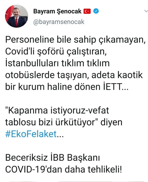 Bayram Şenocak’tan İBB yönetimine eleştiri: Kovid-19’dan daha tehlikeli