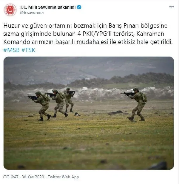 "Huzur ve güven ortamını bozmak için Barış Pınarı bölgesine sızma girişiminde bulunan 4 PKK/YPG'li terörist, kahraman komandolarımızın başarılı müdahalesi ile etkisiz hale getirildi."