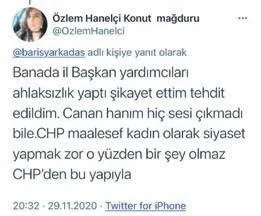 ÖZLEM Hanelçi CHP'li bir aileden geldiğini söyleyerek "Babaannem Dolmabahçe'ye gelin gelmiş. Atatürk'ün akrabalarıyız. Selanik'ten geliyoruz. Şikâyet etsem ne olacak ki, kim duyuyor? Hatta kadın kabahatliymiş gibi davranıyorlar. Bu yüzden savcılığa başvurmadım. Ancak iki yıl önce CHP Avcılar İlçe teşkilatında uğradığım bir tacizle ilgili savcılığa şikâyette bulundum. Parti hiçbir şey yapmadı..." dedi.
