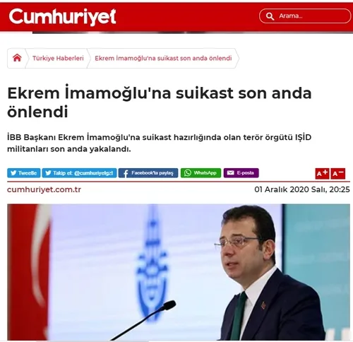 Cumhuriyet, 'Ekrem İmamoğlu'na Suikast Son Anda Önlendi' başlıklı haberinde, şu ifadelere yer verdi: "İBB Başkanı Ekrem İmamoğlu'na suikast hazırlığında olan terör örgütü IŞİD militanları son anda yakalandı. İBB Başkanı Ekrem İmamoğlu'na terör örgütü IŞİD suikast emri verdi. Koruma sayısı arttırılan İmamoğlu'na yapılacak suikast son anda önlendi."