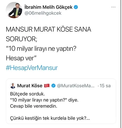 Ankara Büyükşehir AK Parti Grup Başkanvekili Murat Köse belediye meclisinde Ankara Büyükşehir Belediyesi Başkanı Mansur Yavaş’a “10 milyarlık parayı nereye harcadınız?” diye sordu. Köse sosyal medyadan “Bütçede sorduk. ‘10 milyar lirayı ne yaptın?’ diye. Cevap bile veremedin. Çünkü kestiğin tek kurdela bile yok? Algı balonun patlamak üzere. Hesap ver Mansur” dedi. İbrahim Melih Gökçek, “10 milyar lirayı ne yaptın? Hesap ver” diyerek tepki gösterdi. #HesapverMansur hastaghı Türkiye’de birinci, dünyada dördüncü sırada yer aldı. İşte belediye meclisindeki o konuşma: