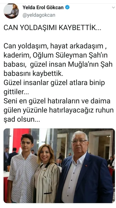 Gökcan sosyal medya üzerinden verdiği acı haberi şu sözlerler duyurdu: "CAN YOLDAŞIMI KAYBETTİK... Can yoldaşım, hayat arkadaşım , kaderim, Oğlum Süleyman Şah'ın babası, güzel insan Muğla'nın Şah babasını kaybettik. Güzel insanlar güzel atlara binip gittiler... Seni en güzel hatıraların ve daima gülen yüzünle hatırlayacağız ruhun şad olsun..."