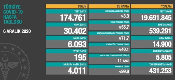 6 ARALIK TÜRKİYE CORONA VİRÜS VAKA VE ÖLÜ SAYILARI
