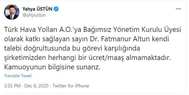 Yahya Üstün; "Türk Hava Yolları A.O.'ya Bağımsız Yönetim Kurulu Üyesi olarak katkı sağlayan sayın Dr. Fatmanur Altun kendi talebi doğrultusunda bu görevi karşılığında şirketimizden herhangi bir ücret/maaş almamaktadır. Kamuoyunun bilgisine sunarız" dedi.