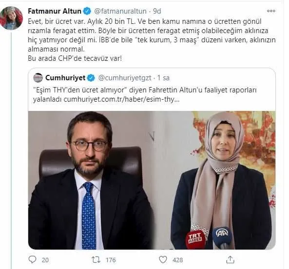 Altun, Cumhuriyet Gazetesi'nin "'Eşim THY'den ücret almıyor' diyen Fahrettin Altun'u faaliyet raporları yalanladı" başlıklı haberine atıfta bulunarak, "Evet, bir ücret var. Aylık 20 bin TL. Ve ben kamu namına o ücretten gönül rızamla feragat ettim. Böyle bir ücretten feragat etmiş olabileceğim aklınıza hiç yatmıyor değil mi? İBB'de bile 'tek kurum, 3 maaş' düzeni varken, aklınızın almaması normal. Bu arada CHP'de tecavüz var!" dedi.