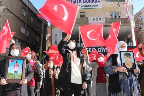 Şırnak'ta çocukları ve yakınları terör örgütü PKK tarafından kaçırılan aileler, şehit ve gazi yakınları, Şehit Üsteğmen Mehmet Esin Caddesi'nde yürüyüş yaparak ellerinde Türk bayraklarıyla terör örgütü PKK'yı protesto etti. Yoğun güvenlik önlemleri altında HDP İl Başkanlığı önüne gelen kadınlar, HDP'ye ve terör örgütü PKK'ya tepkilerini dile getirdi. PKK'lı teröristlerce dağa kaçırılan çocuklarının fotoğraflarını taşıyan aileler, "Kahrolsun PKK, işbirlikçi HDP", "Türk Kürt kardeştir ayrım yapan kalleştir" sloganları attı. Şırnaklı kadınların 14'üncü haftadaki eylemi, HDP'li bir grup tarafından engellenmek istendi. HDP il binası önüne gelen kadınlar, partililer tarafından kurulan ses sistemiyle, yüksek tonda müzik çalınıp, slogan atılarak engellenmeye çalışıldı. Kadınlar, engellemelere rağmen, il binası önünde teröre tepkilerini dile getirdi.