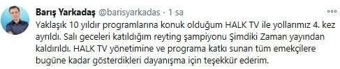 Son dakika haberi... CHP'deki tecavüz skandallarına en net tepki gösteren isimlerden biri olan eski CHP İstanbul Milletvekili Barış Yarkadaş'ın Halk TV'de yorumculuğunu yaptığı 'Şimdiki Zaman Siyaset' programı kaldırıldı.