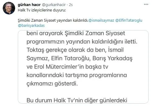 Gazeteci Gürkan Hacır, Halk TV'deki "Şimdiki Zaman Siyaset" programının yayından kaldırıldığını duyurdu. Kişisel Twitter hesabı üzerinden açıklama yapan Hacır, "Toktaş gerekçe olarak da ben, İsmail Saymaz, Elfin Tataroğlu, Barış Yarkadaş ve Erol Mütercimlerin'in başka TV kanallarındaki tartışma programlarına çıkmamızı gösterdi" ifadelerini kullandı. Bunun ardından Yarkadaş da sosyal medya hesabından bir açıklama yaparak, "Yaklaşık 10 yıldır programlarına konuk olduğum HALK TV ile yollarımız 4. kez ayrıldı. Salı geceleri katıldığım reyting şampiyonu Şimdiki Zaman yayından kaldırıldı. HALK TV yönetimine ve programa katkı sunan tüm emekçilere bugüne kadar gösterdikleri dayanışma için teşekkür ederim" dedi.