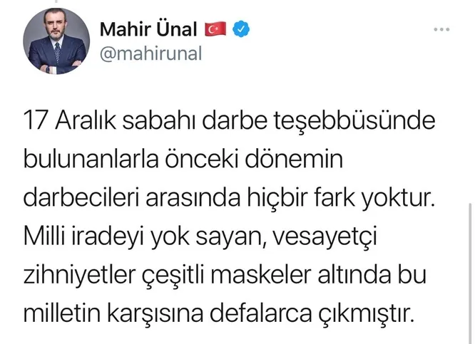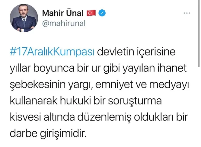 AK Parti Genel Başkan Yardımcısı Mahir Ünal, 17 Aralık Kumpası ile alakalı sosyal medyadan bir açıklama yayınladı. Ünal, 17 Aralık Kumpası'nın devletin içerisine yıllar boyunca bir ur gibi yayılan ihanet şebekesinin yargı, emniyet ve medyayı kullanarak hukuki bir soruşturma kisvesi altında düzenlenen bir darbe girişimi olduğunu söyledi.