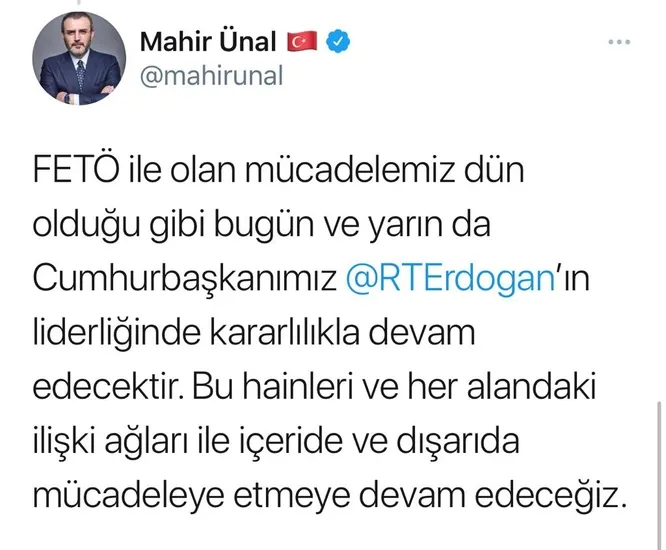 "Hain FETÖ'cü yapılanma ülkemizin her alanda tam bağımsızlık mücadelesinden rahatsız olanların maşalığını yapmıştır. 7 Şubat MİT operasyonu, Gezi ve 17 Aralık kumpası ile devam eden süreç 15 Temmuz darbe girişimi ile bu örgütün devletimize ve milletimize alçakça bir tuzakları bertaraf edilmiştir."
