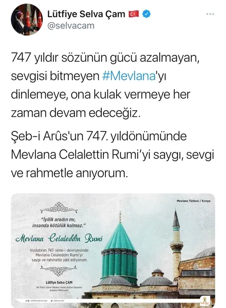 Çam, "747 yıldır sözünün gücü azalmayan, sevgisi bitmeyen #Mevlana'yı dinlemeye, ona kulak vermeye her zaman devam edeceğiz. Şeb-i Arûs'un 747. yıldönümünde Mevlana Celalettin Rumi'yi saygı, sevgi ve rahmetle anıyorum" ifadelerini kullandı.