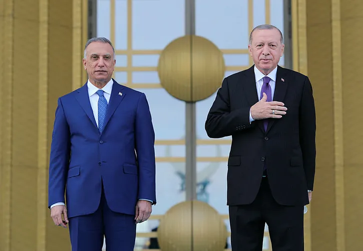 Kazımi, Muhafız Alayı Tören Kıtası'nı Türkçe, "Merhaba asker" diyerek selamladı. Törende, tarihte kurulan 16 Türk devletini temsil eden bayraklar ve askerler de yer aldı. İki ülke heyetlerinin takdimi sonrasında Erdoğan ve Kazımi, merdivenlerde Türkiye ve Irak bayrakları önünde gazetecilere poz verdi.