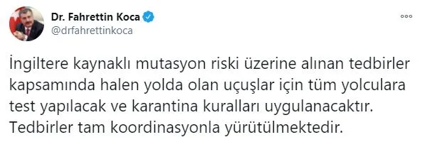 İngiltere kaynaklı mutasyon riski üzerine alınan tedbirler kapsamında halen yolda olan uçuşlar için tüm yolculara test yapılacak ve karantina kuralları uygulanacaktır. Tedbirler tam koordinasyonla yürütülmektedir.