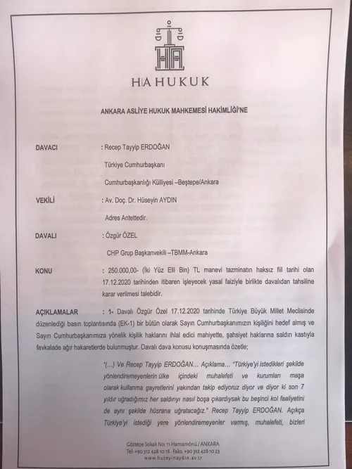 Cumhurbaşkanı Recep Tayyip Erdoğan, CHP grup başkanvekili Özgür Özel'in haddini aşan, densiz ve küstah sözlerini yargıya taşıyarak 250 bin liralık manevi tazminat davası açtı. Cumhurbaşkanı Erdoğan'ın avukatı Hüseyin Aydın'ın açtığı davanın dilekçesinde, Özel'in 17 Aralık 2020'de TBMM'de düzenlediği basın toplantısında "Erdoğan'a yönelik, kişilik haklarını ihlal edici mahiyette, şahsiyet haklarına saldırı kastıyla, fevkalade ağır hakaretlerde bulunduğu" belirtildi.