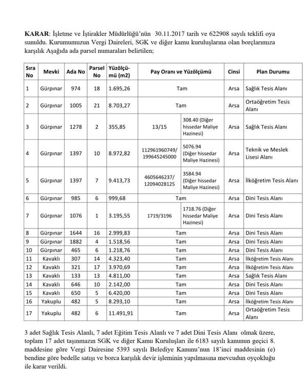 Ancak İBB Başkanı Ekrem İmamoğlu'nun Beylikdüzü Belediye Başkanı olduğu dönemde borçlarına karşılık yaptığı satışlara değinilmedi. SABAH gazetesinin elde ettiği görüntü ve meclis kararına göre 3 adet sağlık tesisi alanı, 7 adet eğitim tesisi alanı ve 7 adet cami (dini) tesis alanı olmak üzere toplamda 17 adet araziyi vergi daireleri, SGK ve diğer kurumlara olan borçları karşılığında sattığı ve borca karşılık devir yaptığı görüldü.