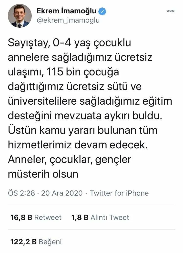 Soru: "Kamuoyuna şöyle yansıdı: Sayıştay raporundan da hareketle İstanbul Büyükşehir Belediyesi'nin süt dağıtımı engellendi. 'Süt dağıtmasınlar gibi' Ama Sayıştay raporunun hiçbir yerinde İstanbul Büyükşehir Belediyesi'nin sosyal yardım amacıyla muhtaç ve yoksul insanlara süt veya paketlenmiş süt dağıtılmayacağı ifade geçmiyor."