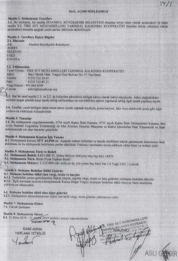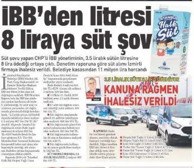 Raporda; İstanbul'da dağıtılacak sütün ihale yapılmaksızın 8 milyon 835 bin TL+KDV bedelle İzmir'de faaliyet gösteren S.S. Tire Süt Müstahsilleri Tarımsal Kalkınma Kooperatifi'nden mal alımı sözleşmesiyle alındığı, süt alımının ihaleden istisna kapsamında olmadığına dikkat çekildi.