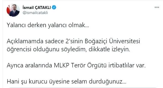 İçişleri Bakanlığı Sözcüsü Çataklı ise Kaftancıoğlu'na yine Tiwitter'dan tepki gösterdi. Kaftancıoğlu'nun kendisini yalancılıkla suçlarken yalancı konumuna düştüğünü belirten Çataklı "Yalacı derken yalancı olmak…Açıklamamda sadece 2'sinin Boğazici Üniversitesi öğrencisi olduğunu söyledim, dikkatle izleyin. Ayrıca aralarında MLKP Terör Örgütü irtibatlılar var. Hani şu kurucu üyesine selam durduğunuz…" dedi.