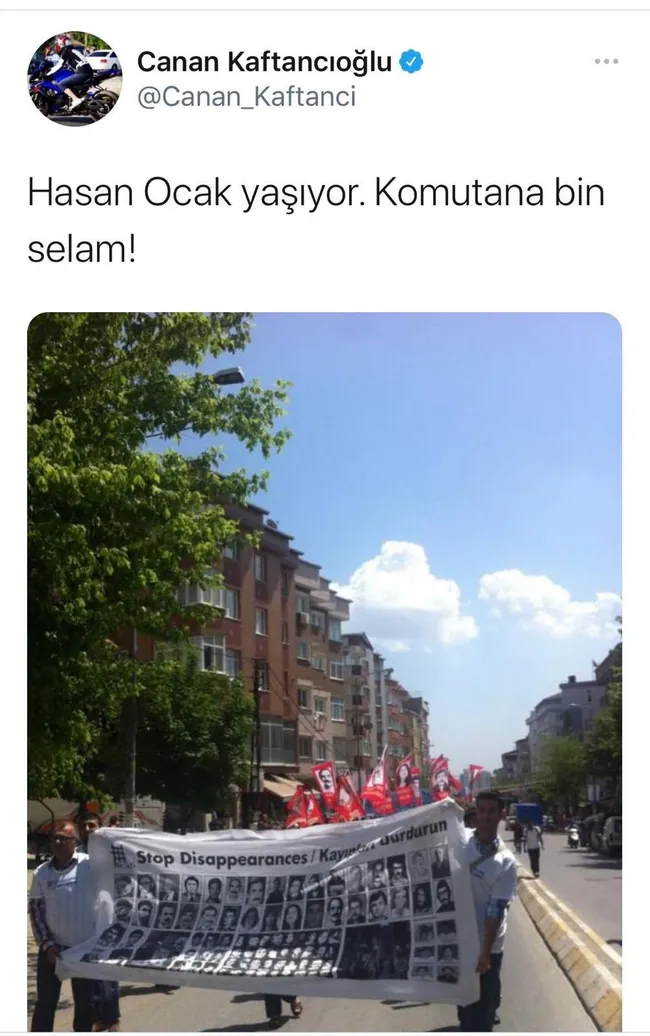 Çataklı ayrıca Kaftancıoğlu'nun terör örgütü MLKP'nin kuruculularından Hasan Ocak'a "Komutan" diyerek 'selam' durduğu gönderisini de paylaştı. Paylaşımda, Canan Kaftancıoğlu, terör örgütünün protesto gösterisinin fotoğrafına "Hasan Ocak yaşıyor. Komutana bin selam!" yazdığı görülüyor.