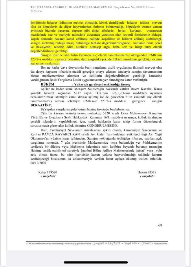 İstanbul Anadolu 58. Asliye Ceza Mahkemesi Hakimi Özlem Yayla, hakaret suçunun unsurlarının oluşmadığı yönünde bir değerlendirmeyle, sanık Menşure Sütlüeroğlu hakkında beraat kararı verdi. Mahkeme, "köpek gibi havlayanların dili dibine giriyor' şeklindeki sözlerin, hakaret unsuru taşımadığı yönünde skandal bir değerlendirme yaptı. Kararda, köpeklerin havlayarak kendilerini ifade ettikleri, bir insana aslan, kaplan dendiğinde hakaret iddiasının mevcut olmadığı, köpeklerin de diğer hayvanlardan farkı bulunmadığı, insanların sevimli dostları olduğu ifade edildi.