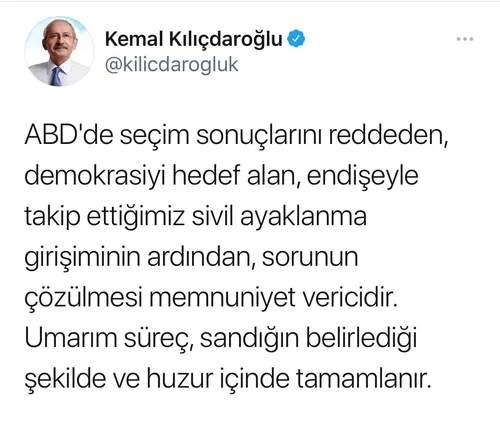 Cumhuriyet Halk Partisi (CHP) Genel Başkanı Kemal Kılıçdaroğlu, ABD'deki kongre binasında yaşananlarla ilgili olarak bir açıklama yayınladı. Kılıçdaroğlu, "ABD'de seçim sonuçlarını reddeden, demokrasiyi hedef alan, endişeyle takip ettiğimiz sivil ayaklanma girişiminin ardından, sorunun çözülmesi memnuniyet vericidir. Umarım süreç, sandığın belirlediği şekilde ve huzur içinde tamamlanır" dedi.