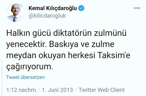 CHP Genel Başkanı Kemal Kılıçdaroğlu, şiddetin her türlüsü yaşandığı halde Gezi Kalkışması’nı desteklemiş, “Halkın gücü diktatörün zulmünü yenecektir. Baskıya ve zulme meydan okuyan herkesi Taksim’e çağırıyorum” demişti. Kılıçdaroğlu, ABD Başkanı Donald Trump’ın destekçilerinin ABD kongre binasını basmasını ise sivil ayaklanma olarak tanımladı. İşte o iletileri: