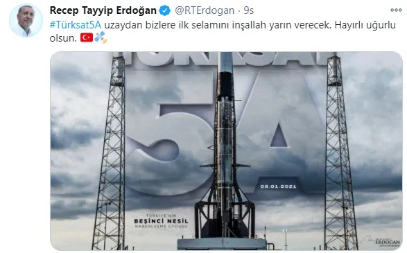 Türkiye'nin 5'inci nesil uydusu Türksat 5A, Space X firmasına ait Falcon 9 roketi ile uzaya gönderildi.