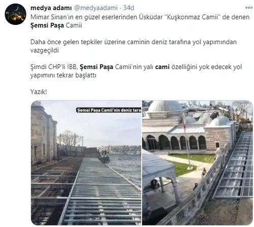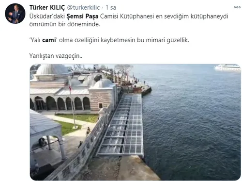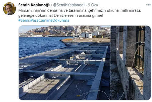 Mimar Ebubekir Şimşek: "İstanbul'un kronikleşen deniz kıyılarına müdahale hevesi. Bu refleks yüzünden neredeyse İstanbul'un yalı camisi kalmadı. Durdurulan Şemsi Paşa Camii'ni denizden uzaklaştıran proje tekrar başlamış. Proje İBB'ye ait. Umarım bu yanlıştan dönülür. Şemsi Paşa Camii'nin kıyı ile bağlantısı tamamen kopuyor. 2017 yılında zor bela durdurulmuştu. İBB, kaldığı yerden devam ediyor. Üstelik kazık çakılmadan konsol olarak denize uzatılıyor. Zayıf olan eski kıyı kaldırımından mesnetlenmesi statik açısından da problemli. Lütfen durun."