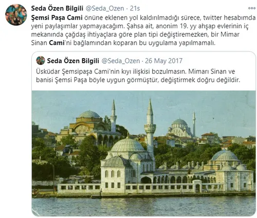 Mimar Seda Özen Bilgili: "Şemsi Paşa Cami önüne eklenen yol kaldırılmadığı sürece, twitter hesabımda yeni paylaşımlar yapmayacağım. Şahsa ait, anonim 19. yy ahşap evlerinin iç mekanında çağdaş ihtiyaçlara göre plan tipi değiştiremezken, bir Mimar Sinan Cami'ni bağlamından koparan bu uygulama yapılmamalı."