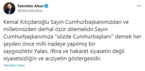 "Kemal Kılıçdaroğlu Sayın Cumhurbaşkanımızdan ve milletimizden derhal özür dilemelidir. Sayın Cumhurbaşkanımıza "sözde Cumhurbaşkanı" demek her şeyden önce milli iradeye yapılmış bir saygısızlıktır. Yalan, iftira ve hakaret siyasetin değil siyasetsizliğin ve acziyetin göstergesidir."