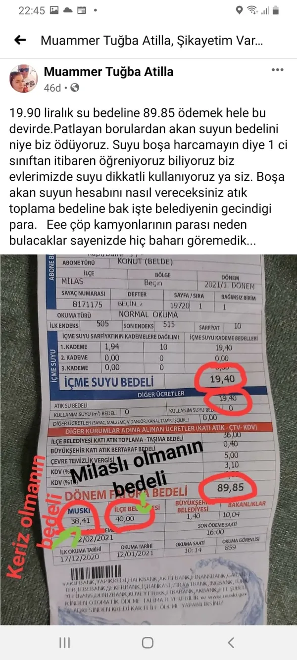 "Biz 4 kişilik bir aileyiz, anne baba 2 küçük çocuk. Muğla Milas da yaşıyoruz. Malum zor bir dönemden geçiyoruz. Biz 'tasarruf edelim' diyoruz. Her yerden harcamalarımızı kısıtlıyoruz, ihtiyacımızı ihtiyaç olduğu kadar harcamaya çalışıyoruz. Ama... Bugün gelen su faturasında belediyemizin yanımızda olmadığını bir kerede daha anlamış oldum. 19.90 liralık su harcamamıza rağmen 89.85 lira faturamız gelmiş. Neyin bedelini ödüyoruz anlamış değiliz. Boşa akan suyun mu? Yoksa alınan yeni çöp kamyonun parasını mı? Biz evde 1 ay durmasak fatura kaç para gelir merak konusu. Galiba alırlar bizden evde durmadığımız halde. Para neden çıkacak yoksa belediyenin parası yanımızda olan, halkını düşünen, milleti seven başkan istiyoruz. Ne zaman dediler 'Mart'ın sonu bahar' o günden beri göremedik baharı. Bize mevsim hep kış. Umarım adalet yerini bulur da bizi sömürmeye devam etmezler. Saygılarımla." ifadelerini kullandı.