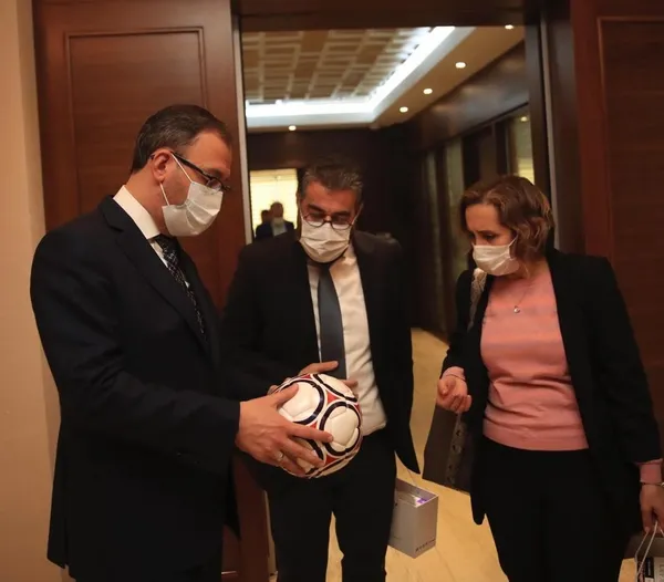 Gençlik ve Spor Bakanı Mehmet Kasapoğlu, Hazal Ateş'in de yer aldığı Ekonomi Muhabirleri Derneği yönetimini kabulünde el yapımı yerli futbol toplarını da tanıttı.