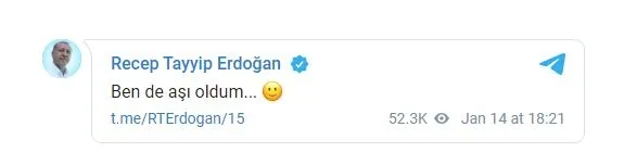 Başkan Recep Tayyip Erdoğan, koronavirüs aşısı oldu. Erdoğan, aşı olduğunu Telegram ve BİP'ten duyurdu.