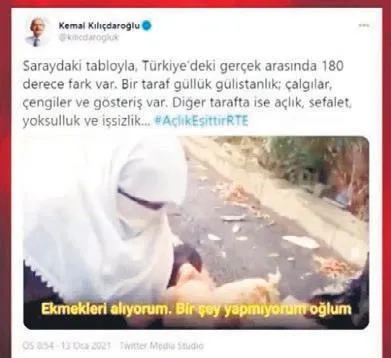 CHP Genel Başkanı Kemal Kılıçdaroğlu, ekonomik kriz algısı oluşturmak için gerçek dışı paylaşımlarına devam ediyor. Kılıçdaroğlu'nun Twitter hesabından paylaştığı 'çöpten yiyecek toplayıp yiyen kadın' görüntülerinin gerçeği yansıtmadığı ortaya çıktı. Kılıçdaroğlu, "çöpten ekmek topluyor" diyerek paylaştığı kadının kendisine fakir görüntüsü verdiği ve lüks sitelerin bulunduğu bölgelerde sık sık çöpten ekmek toplarmış gibi yaparak insanların duygularını sömürdüğü belirtildi. Kadının insanları nasıl kandırdığını gösteren görüntüler, bir televizyon kanalında bir hafta önce özel haber olarak servis edilmişti.