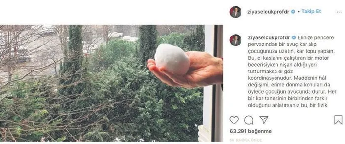 Harmanlanmış eğitimin en verimli şekilde yürütülebilmesi için, her zaman olduğu gibi, yapay zeka, bulut bilişim, sanal gerçeklik, robotik kodlama, nesnelerin interneti ve teknolojinin bize sağladığı benzeri uygulamaları eğitim süreçlerimize entegre ederek yararlanmayı hedefliyoruz Diğer taraftan Bakan Selçuk, sosyal medya hesabından, penceresinin pervazındaki karlardan yaptığı kartopunun fotoğrafını paylaştı. Selçuk, ebeveynlere kartopu yaparak çocuklarla sohbet etmeyi önerdi. ANKARA