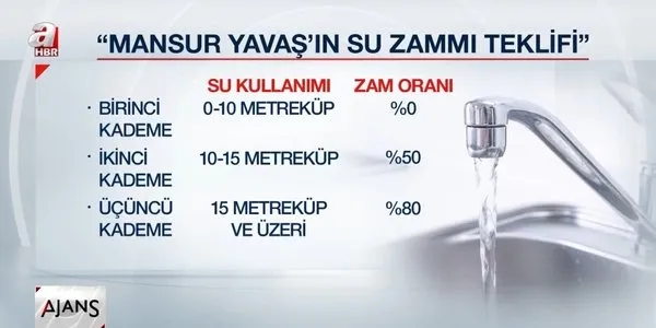 Yavaş'ın teklifine göre 0 ile 10 metreküp arası zam yok.10 ile 15 metreküp arasında su kullananların yeni faturaları yüzde 50 oranında zamlı tarifeyle gelecek. 15 metreküpün üzerinde kullananlara ise yüzde 80 zamla karşı karşıya kalacak.