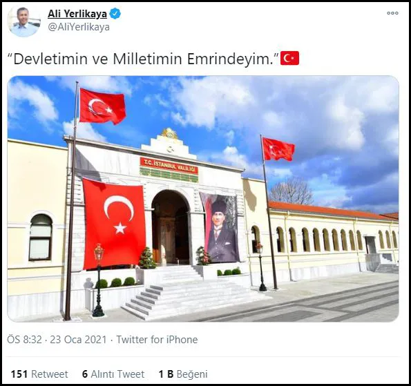 İstanbul Valisi Yerlikaya vali ve kaymakamlar için çirkin ifadeler kullanan CHP’li Berhan Şimşek’e tepki gösterdi. Vali Yerlikaya skandal ifadeler ardından, “Devletimin ve Milletimin Emrindeyim.”şeklinde sosyal medya paylaşımında bulundu.