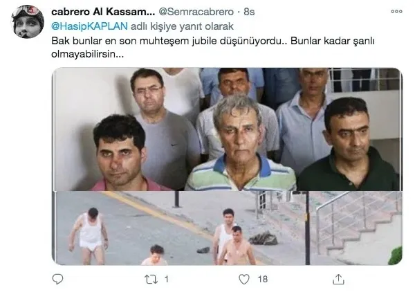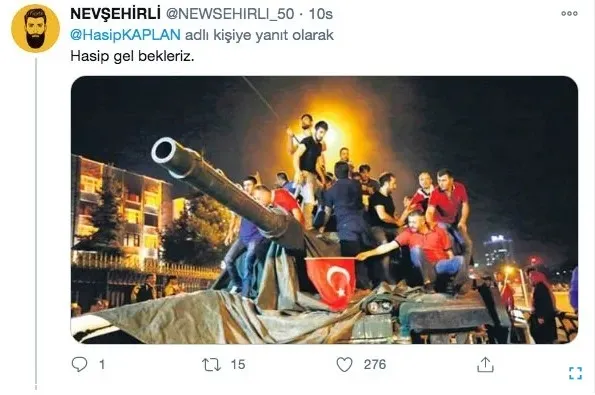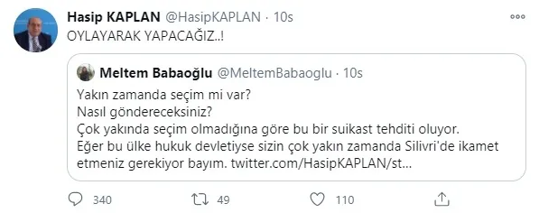 Kaplan'ın söz konusu paylaşımının altına yüzlerce tepki mesajı gelirken, bir sosyal medya kullanıcısının "Yakın zamanda seçim mi var? Nasıl göndereceksiniz? Çok yakında seçim olmadığına göre bu bir suikast tehdidi oluyor. Eğer bu ülke bir hukuk devletiyse sizin çok yakın zamanda Silivri'de ikamet etmeniz gerekiyor bayım" paylaşımı üzerine çark etti. Kaplan, kendisine yönelik bu mesaja, "oylayarak yapacağız" şeklinde cevap verdi.