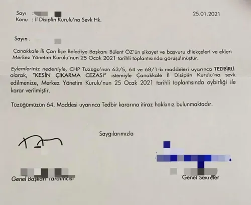 Mektubun ardından İl Disiplin Kuruluna sevk edilen Hasan Arslan'ın eline karar ulaştı. Karar da " Çanakkale İli Çan İlçesi Belediye Başkanı Bülent Öz, ün şikayet ve başvuru dilekçeleri ve ekleri Merkez Yönetim Kurulu'nun 25 Ocak 2021 tarihli toplantısında görüşülmüştür. Eylemleriniz nedeniyle CHP Tüzüğü'nün 63/5 , 64 ve 68/1-b maddeleri uyarınca TEDBİRLİ olarak "KESİN ÇIKARMA CEZASI" istemiyle Çanakkale İl Disiplin Kurulu'na sevk edilmenize Yönetim Kurulu'nun 25 Ocak 2021 tarihli toplantısında oy birliğiyle karar verilmiştir" dendi.