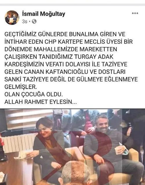 İzmit Sanayi Mahallesi Muhtarı olan İsmail Moğoltay da yaptığı paylaşımda, "Geçtiğimiz günlerde bunalıma giren ve intihar eden CHP Kartepe Meclis Üyesi bir dönem de mahallemizde markette çalışırken tanıdığımız Tugay Adak kardeşimizin vefatı dolayısı ile taziyeye gelen Canan Kaftancıoğlu ve dostları sanki taziyeye değil de gülmeye eğlenmeye gelmişler, olan çocuğa oldu. Allah rahmet eylesin" ifadelerini kullandı. Tugay'ın arkadaşları ve çok sayıda vatandaş da yerel internet sitesindeki haberin altına yorumlar yaparak, "Sahip çıkmadınız, acısına saygı duyun" diyerek tepki gösterdiler. Yapılan yorumlardan bazıları şöyle: "Ayıptır hiç utanmanız yok mu, olan ölene oldu", "Resmin tamamına bakıldığında Birkan beyin arkasında duranların da güldüğü görülüyor", "Ne kadarda üzgün görünüyorlar, içim parçalandı...."
