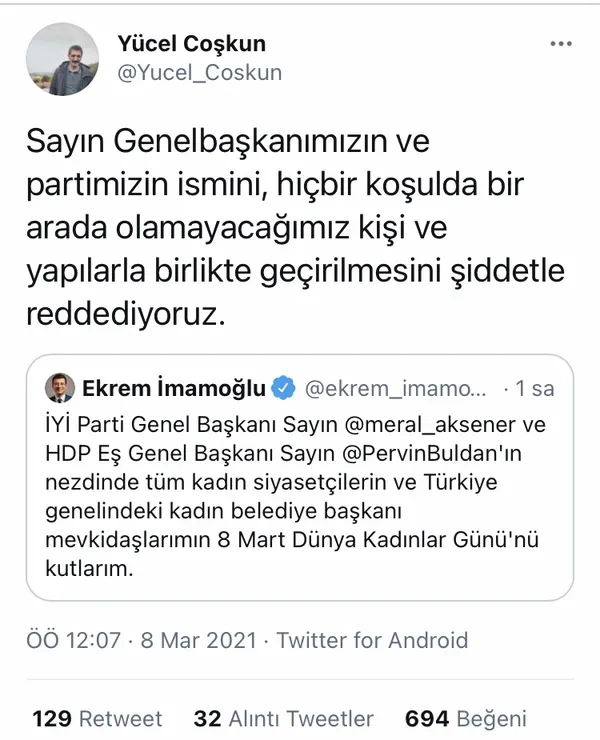 İYİ Parti’den İBB Başkanı Ekrem İmamoğlu’nun 8 Mart Dünya Kadınlar Günü kutlamasına tepkiler sürüyor. İYİ Parti Sözcüsü Yavuz Ağıralioğlu: "Anneleri yıllardır evlâtsız bırakan bir cinayet şebekesine mesafesizliğini milli hassasiyet ve haysiyet itirazımız olarak ifade ettiğimiz HDP ve siyasilerinin isimlerinin, şehit annelerine borcunu vatan borcu bilen Meral Akşener ismi ile birlikte zikredilmesini doğru bulmuyorum" ifadelerini kullandı. İYİ Parti İstanbul İl Sekreteri ve Kurucular Kurulu Üyesi Yücel Coşkun: "Sayın Genel başkanımızın ve partimizin ismini, hiçbir koşulda bir arada olamayacağımız kişi ve yapılarla birlikte geçirilmesini şiddetle reddediyoruz" dedi.
