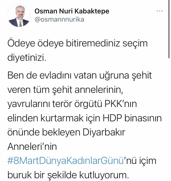 AK Parti İstanbul İl Başkanı Osman Nuri Kabaktepe de, Ekrem İmamoğlu'nu eleştirdi "Ödeye ödeye bitiremediniz seçim diyetinizi. Ben de evladını vatan uğruna şehit veren tüm şehit annelerinin, yavrularını terör örgütü PKK'nın elinden kurtarmak için HDP binasının önünde bekleyen Diyarbakır Anneleri'nin 8 Mart Dünya Kadınlar Günü'nü içim buruk bir şekilde kutluyorum" diye konuştu.