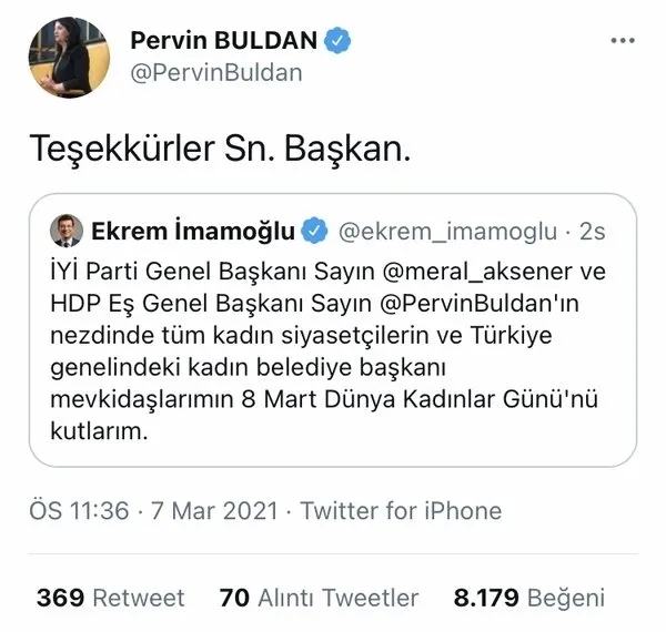 Bu paylaşımın ardından HDP Eş Genel Başkanı Pervin Buldan da; Ekrem İmamoğlu'nun paylaşımını etiketleyerek, "Teşekkürler Sayın Başkan" dedi.