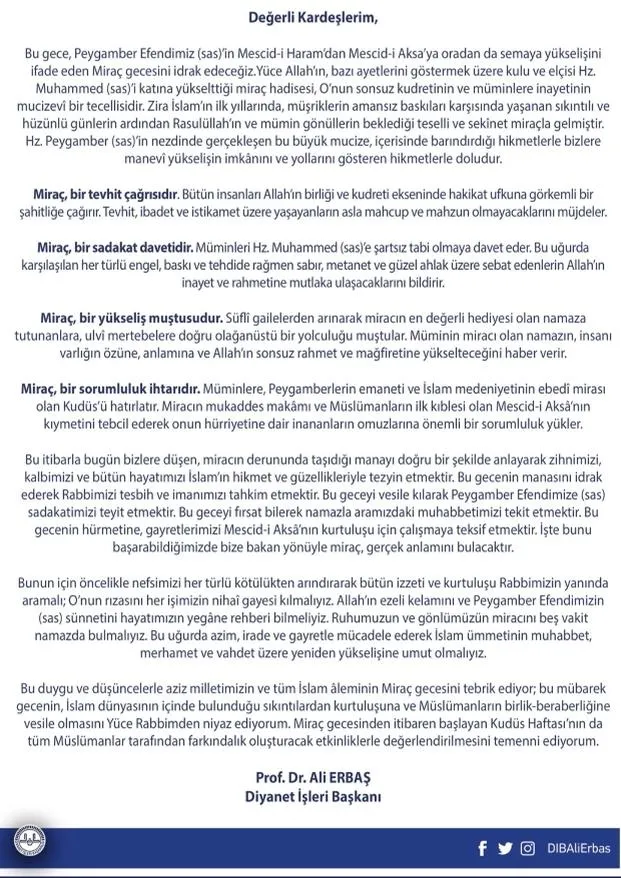 Diyanet İşleri Başkanı Prof. Dr. Ali Erbaş, İslam âleminin Miraç kandilini kutlayan ve Miraç hadisesinin Müslümanlar için önemine değinildiği bir mesaj yayınladı. Diyanet İşleri Başkanı Prof. Dr. Ali Erbaş mesajında "Bugün bizlere düşen bu gecenin hürmetine, gayretlerimizi Mescid-i Aksâ'nın kurtuluşu için çalışmaya teksif etmektir. İşte bunu başarabildiğimizde bize bakan yönüyle miraç, gerçek anlamını bulacaktır" ifadelerini kullandı. Miracın bir sorumluluk ihtarı olduğunu belirten Prof. Dr. Erbaş, "Miraç, bir sorumluluk ihtarıdır. Müminlere, Peygamberlerin emaneti ve İslam medeniyetinin ebedî mirası olan Kudüs'ü hatırlatır. Miracın mukaddes makâmı ve Müslümanların ilk kıblesi olan Mescid-i Aksâ'nın kıymetini tebcil ederek onun hürriyetine dair inananların omuzlarına önemli bir sorumluluk yükler" dedi. İşte Diyanet İşleri Başkanı Prof. Dr. Ali Erbaş'ın Miraç Kandili mesajı: